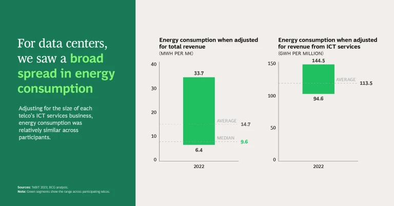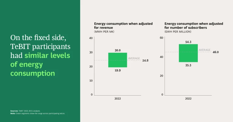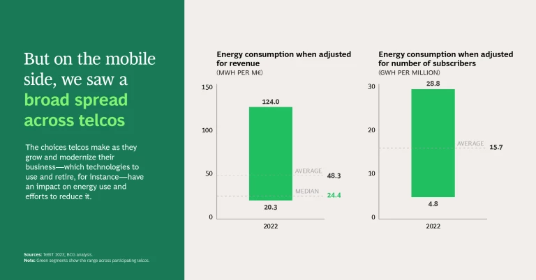 EV adoption wasn’t the only place where the study revealed sharp differences. Looking at overall energy consumption, we saw a broad spread on the mobile side, both when we adjusted for revenue and when we factored in number of subscribers (for fixed, consumption was relatively even in each analysis). Why the variance? Possible explanations quickly come to mind. Some telcos operate in countries with large rural areas, which require more towers and more energy than densely populated urban areas. And different network technologies, such as 5G, 4G, and 3G, have different impacts on energy use. This spotlights a critical point—that a telco’s energy consumption and costs are impacted by decisions they make on issues like what network and IT components to use, what traffic management tools to embrace, how and when to employ power-savings modes or cell sleep modes, and whether to replace certain technologies, such as copper or coax in fixed or 2G/3G in mobile.