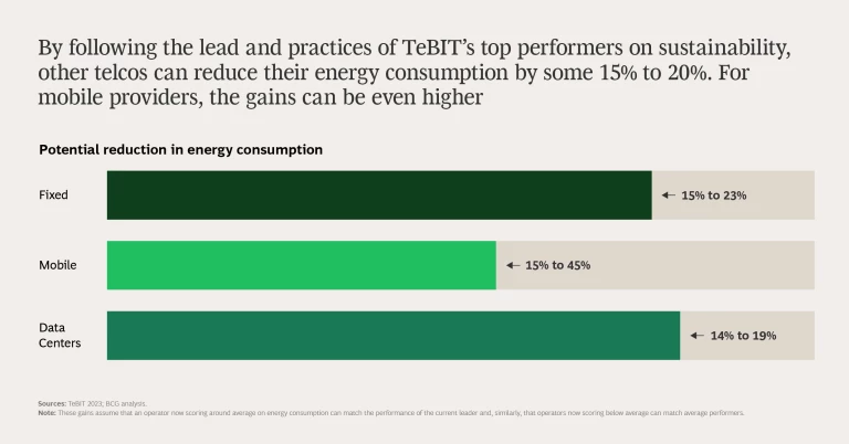 The best performing telcos—those that have made the biggest strides in optimizing their energy use—show the potential that other operators are leaving on the table. They also show the decisions that are paying off, such as using energy-efficient components and optimizing networks with respect to energy consumption. Stepping up one’s game has clear and achievable rewards. By our estimates, TeBIT participants now falling around or below the average in energy consumption can reduce usage by some 15% to 20% in their fixed and data center businesses—and up to an eye-opening 45% in mobile.