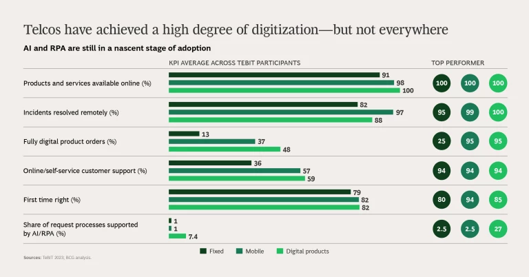 That’s changed with time—but not across the board. This year’s study looks at the same KPIs and, in many areas, finds a high degree of digitization or marked improvement. On average, TeBIT participants now offer more than 90% of their products and services online. On the mobile side, 97% of incidents are resolved remotely (for fixed, the average is 82%). Yet AI and robotic process automation (RPA) are still very much in a nascent stage. On average, these technologies support just 1% of customer requests, for both fixed and mobile. Even the “leaders” aren’t much ahead, with AI and RPA supporting just 2.5% of requests.