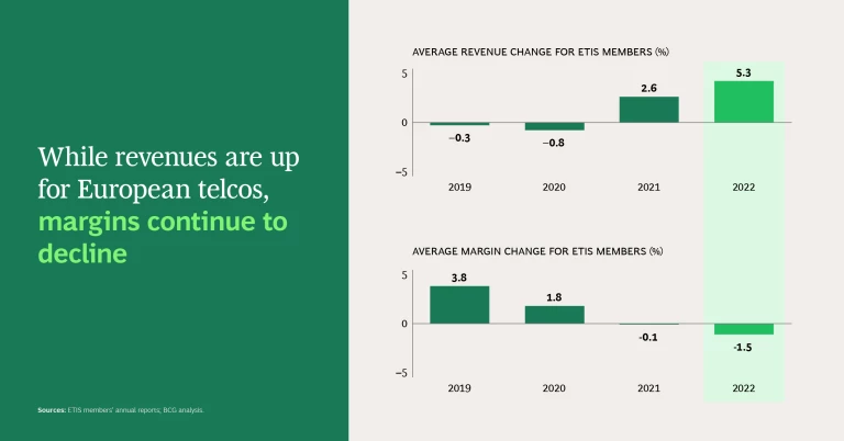 On the revenue side, ETIS members continue to show positive, if not electrifying, momentum. Overall, revenues rose 5.3% in 2022, up from a 2.6% increase in 2021. Digital and ICT services, price premiums, and expansion beyond the core—in areas like media, eHealth, and even financial services—all gave the top line a bump.