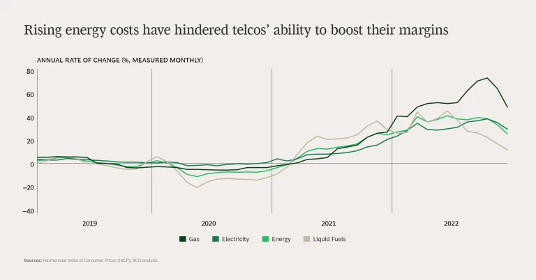 The squeeze is coming from multiple fronts, but two factors, energy costs and inefficient processes, are particularly noteworthy. Energy prices reached record levels in Europe in 2022 and are prone to quick, often unfavorable, shifts. Inefficient processes are both time-consuming and resource intensive. But the main reason to call out these factors is that telcos have new tools—and increasingly strong incentives—to manage them.