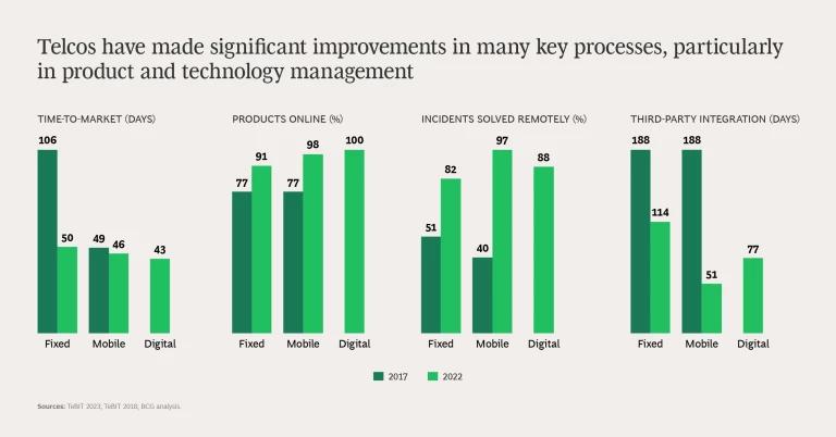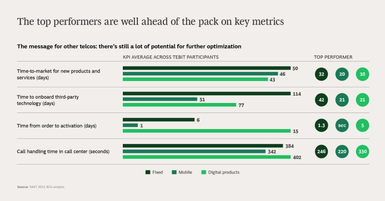Indeed, the gap between top and average score is often pronounced. On the fixed side, for instance, time from order to activation averages six days. But the best performer does it in just over one day. For digital products, the average time-to-market is 43 days. But for one participant, it’s 10 days. For telcos trailing the leaders, the message is clear: there is significant potential for further optimization.