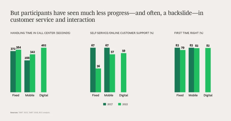In other areas, some telcos are breaking clear of the crowd. For fully digital product orders and self-service customer support—KPIs where the average is well below 50% for fixed and mobile—the best performer scores above 90%.