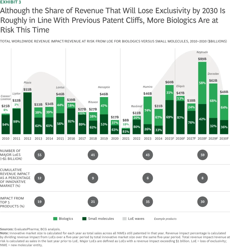 Pharma is fast approaching a steep patent cliff, as drugs representing some $350 billion in annual worldwide revenues will lose their exclusivity through 2030. The top 20 pharma companies account for 80% of this revenue loss. Although the percentage of cumulative branded drug revenue at risk appears similar to that in the most recent previous major wave of loss of exclusivity (LoE)—8% for the period from 2026 to 2030 compared with 12% from 2010 to 2015—there are at least two major differences this time. (See Exhibit 3.)