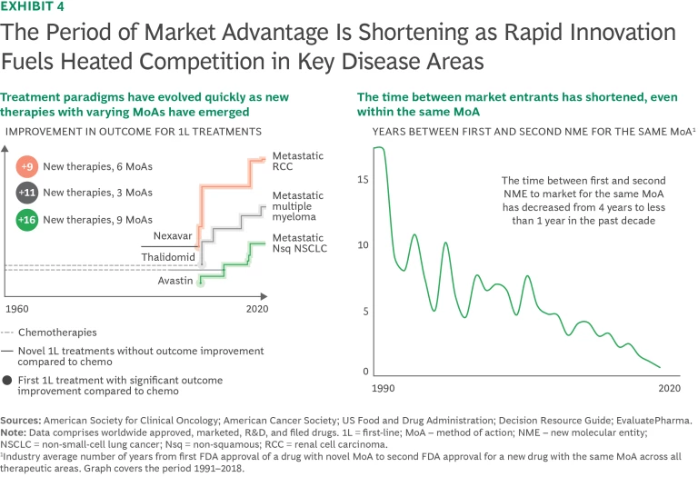 Compounding the revenue pressures from LoE, the period of market advantage for new drugs is shortening as rapid innovation fuels heated competition in key disease areas. (See Exhibit 4.) Treatment paradigms are evolving quickly as new therapies with varying mechanisms of action (MoAs) come to market in rapid succession. Examples include treatments for metastatic multiple myeloma, metastatic renal cell carcinoma, metastatic non-squamous non-small-cell lung cancer, and psoriasis.
