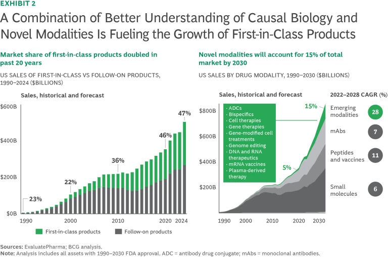 Scientific understanding of the biological drivers of disease, combined with the ability to influence human biology, has never been greater. Looking ahead, we expect new development to accelerate, delivering a wave of breakthrough drugs that will transform the treatment of diseases with significant unmet need. Momentum will be fueled by a surge in the identification of more compelling biological targets and the expansion of therapeutic modalities that enable modulation of both newly discovered and historically undruggable targets. Examples of current new treatments include gene therapies for spinal muscular atrophy, hemophilia A, sickle cell disease, and CAR-T therapies for multiple myeloma. Already, the market share of first-in-class products has risen from 20% in 2000 to 50% today. We estimate that some 15% of the market in 2030 will consist of novel modalities versus only about 5% in 2020. (See Exhibit 2.)