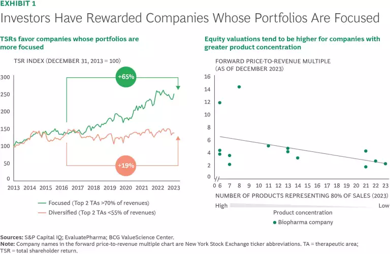 In this context, focus and leadership matter. Our research shows that over the past decade, companies that derive 70% or more of revenues from a subset of therapeutic areas (TAs) have seen a 65% increase in total shareholder return (TSR), compared with only 19% for more diversified firms. (See Exhibit 1.) These companies often hold a leadership position in select TAs, anchored by a few blockbuster assets and a positive flywheel effect, deriving meaningful expertise, cost, and relationship benefits from their scale. In light of this, we believe that concentrating R&D and commercialization resources and expertise on areas of core strength is the most effective way to cut through complexity, de-risk investments, and deliver results for patients and shareholders alike. The companies that thrive will build leadership in their core areas to drive innovation and efficiency while accelerating speed and agility. By establishing deep connections with stakeholders, they can also more effectively shape the health care ecosystem and payment models to maximize patient access to innovative treatments. All of this needs to be balanced with a certain amount of flexibility to periodically replenish and diversify into other TA or disease areas where there is potential to establish future leadership, by capturing opportunities in new areas of emerging science.
