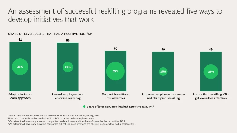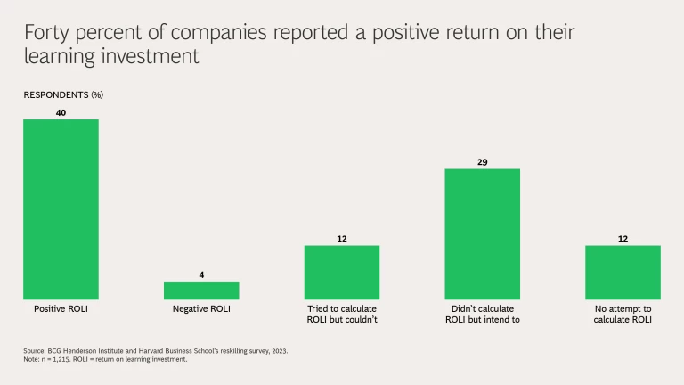The answer lies in reskilling, but not all reskilling initiatives are created equal. The BCG Henderson Institute and Harvard Business School surveyed 1,215 US companies that implemented reskilling programs (defined as programs that help employees transition to completely different roles). We also interviewed 40 executives from leading reskilling innovators. Of the companies we surveyed, 40% reported a positive return on learning investment (ROLI), 4% reported a negative ROLI, and the rest either did not or could not do the calculation.