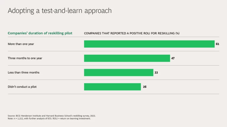 When companies adopt an experimental approach—like they do when launching new products or services—they are more successful at reskilling. In a recent article in Harvard Business Review, we argued that reskilling is more than training—it is a change management exercise that naturally requires early experimentation to get right. Our survey data revealed that of the companies that spent more than one year in a pilot phase—designing, testing, and fine-tuning their reskilling program before scaling it across the organization—61% reported a positive ROLI. Whereas of the companies that didn’t conduct a pilot, only 26% reported a positive ROLI. Clearly, pilots make a difference.