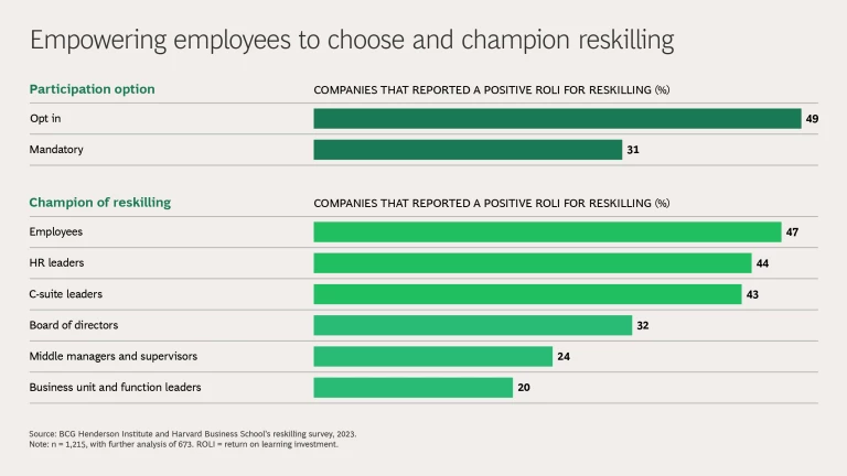 Organizations that allow employees to opt in to reskilling programs are about 1.5 times more likely to yield a positive ROLI for reskilling over companies that mandate certain employees participate given their function, level, or tenure. Having an opt-in strategy is a clear win-win: the employers spend resources on individuals with the right aptitude and attitude for learning and the employees feel empowered to chart their own course.
