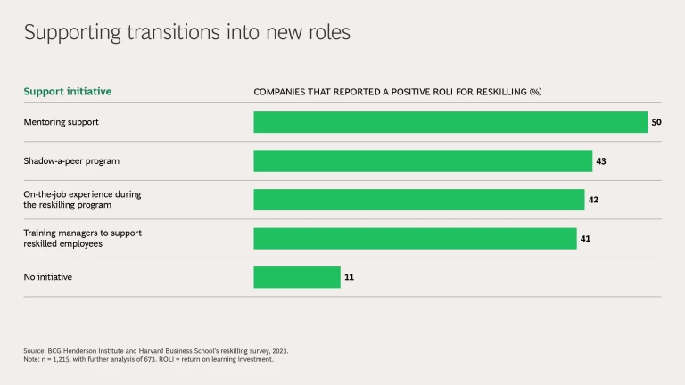Companies that reported a positive ROLI for reskilling provided support for employees after retraining them in the form of mentoring, shadow-a-peer programs, and even training for their manager. Such initiatives ensured that retrained employees were able to quickly ramp up to meet the requirements of their new role.