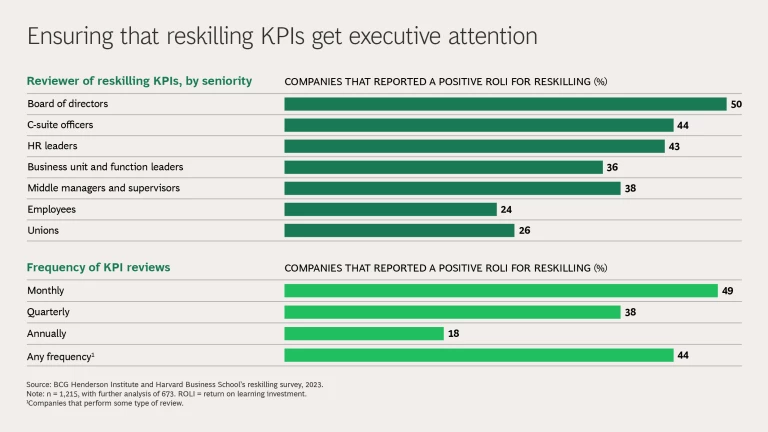 Companies that ensure the systematic tracking of reskilling KPIs—with regular monthly reviews by the board of directors and senior executives, including C-suite leaders—are more likely to report a positive ROLI for reskilling. At Ericsson, for example, reskilling KPIs are part of the key results reviewed quarterly by the executive team.