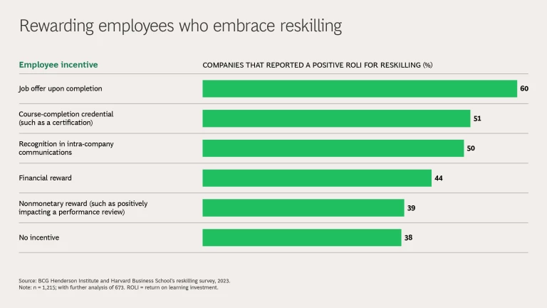 Well-designed employee incentives are effective in delivering a positive ROLI for reskilling programs. Our survey shows that the most effective incentive is offering employees a new job upon completion of the program. This reward improves the chances of having a positive ROLI by about 1.5 times over offering no incentive.