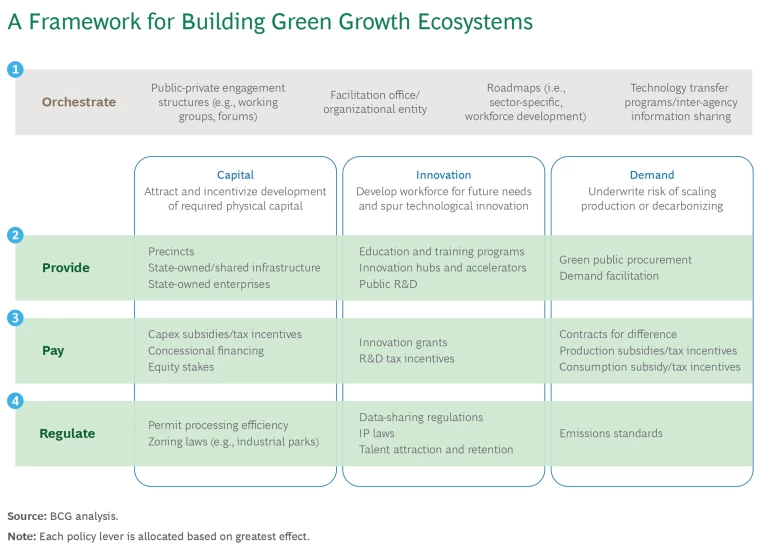 Policymakers have an invaluable role to play in catalyzing green-growth ecosystems that attract private-sector investment. We have distilled the key policies into a framework in the exhibit. First and foremost, policymakers should focus government efforts on the following: