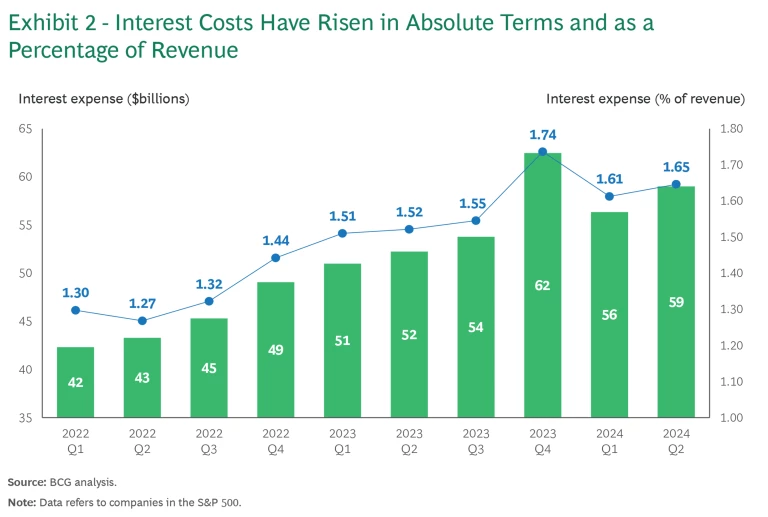 Higher Interest Outflows. The rise in interest rates has driven significantly higher interest expenses across industries—compounded by “cheap debt” rolling off the balance sheet and being replaced by new debt at higher rates. An analysis of nonfinancial S&P 500 companies shows that interest expense as a percentage of revenue grew from 130 basis points in the first quarter of 2022 to 165 basis points in the second quarter of 2024, representing more than $15 billion in additional outflows. (See Exhibit 2.) Given this increase—and the likelihood of interest rates continuing to remain elevated, despite some nominal cuts—ensuring a low cost of funds is vitally important.