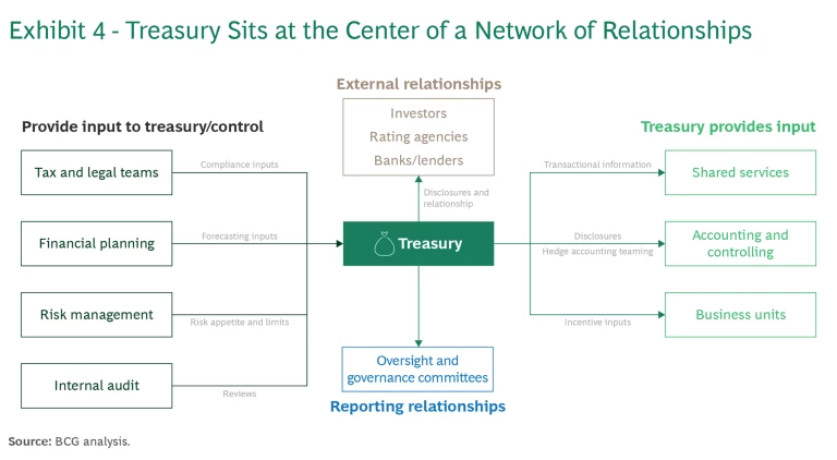 Define clear ownership and accountability. Once companies set principles and establish priorities to optimize the balance sheet, they need to determine who will implement these changes. That will typically entail rethinking processes, redefining roles, and changing the day-to-day work of teams. Treasury is often at the center of balance sheet steering and optimization, with many other stakeholders providing input and leveraging outputs. (Exhibit 4 shows a typical organizational structure.)