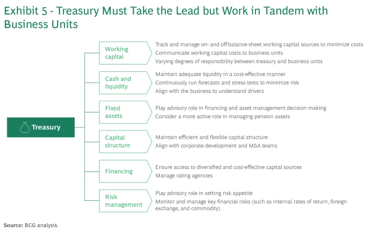It's also critical to stipulate how treasury and finance can work with other parts of the business to drive optimization on an ongoing basis. (See Exhibit 5.)