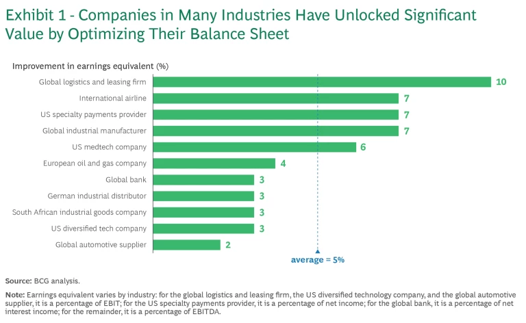 Many companies launch big transformations aimed at improving performance, but they may be overlooking a simpler way to unlock hidden profits: optimizing the balance sheet. In our experience, cleaning up the balance sheet can improve earnings by 5%, on average, and by as much as 10% for some companies. (See Exhibit 1.)