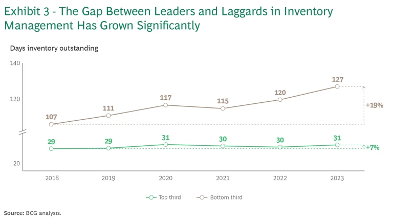Lingering Impact from Pandemic-Related Disruptions. The pandemic resulted in significantly elevated inventory levels across many industries, as managers sought to hedge against supply chain disruptions. Our analysis of over 20,000 companies in the Americas, Europe, and Asia-Pacific shows that while the strongest organizations have managed to bring down these levels to the prepandemic norm, days inventory outstanding remains elevated at many companies—and the gap is growing. (See Exhibit 3.) Working capital optimization—particularly with respect to inventory—thus remains a highly pertinent area of focus.