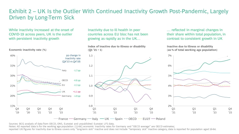 A prime example of this sort of complex challenge is seen in the stark rise in the number of people out of the workforce due to long-term illness. Since 2020 alone, economic inactivity in the UK has risen by 900,000 people, with 85% of this increase due to those who are long-term sick. Currently, around 375 million workdays are lost because of people being out of the workforce due to long-term sickness.