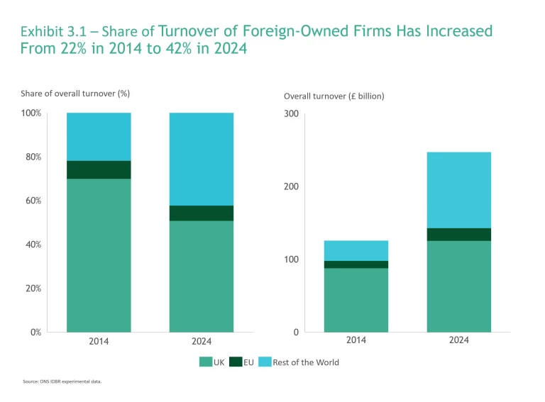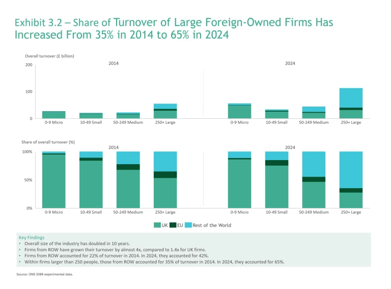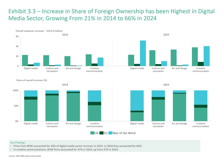 - The changing way people consume content (via streaming services and tech platforms) has resulted in global firms doubling their share of UK turnover. In 2014, foreign-owned firms accounted for 22% of turnover in this sector in the UK. This has now risen to 42%. For large firms, it has increased from 35% to 65%. This has had benefits, for example bringing UK content to new audiences around the world. But it also results in a lower share of UK revenue going to domestic firms, such as the Public Sector Broadcasters (PSBs). In the long run, this could reduce reinvestment into British-made content. For example, although almost all turnover growth in the digital media sector (which includes TV and film) over the past decade came from non-UK firms, in 2021 £5 billion of UK TV production spending still came from domestic firms, compared to £1.8 billion from international firms.