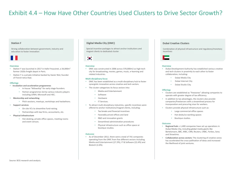 a. Developing innovation hubs to support the competitiveness of UK firms. Create innovation hubs which provide infrastructure (e.g. office space), technology (e.g. cutting-edge studios), wrap around support services (e.g. marketing, legal and business support), training (e.g. developing AI use cases) and opportunities for investment (e.g. by providing a single place to showcase investment opportunities).