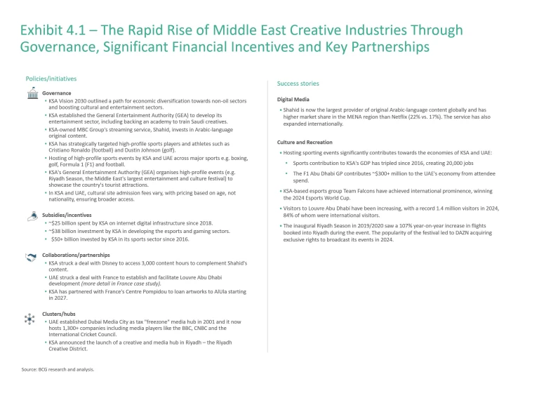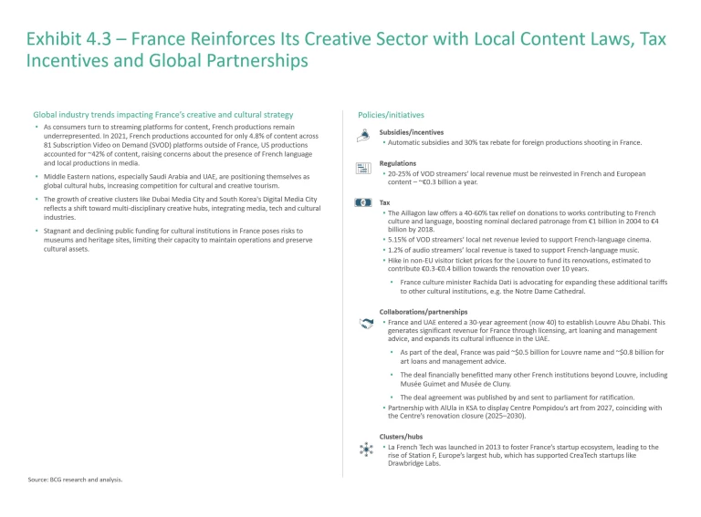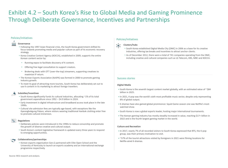 - Countries are making significant policy interventions to build their creative and entertainment sectors. Two common elements seen here are the creation of multi-disciplinary clusters to drive growth, and the leveraging of international partnerships to exchange expertise and open up new audiences (particularly for cultural institutions). Beyond this, policies vary. Countries in the Middle East are putting significant amounts of funding into their sector (for example investing over $38 billion in recent years to develop its gaming and esports industry), while South Korea has adopted an end-to-end strategy from training to supporting content owners in striking the best deals for their IP. Meanwhile, France continues to apply levies (e.g. on streamers and platforms) to drive investment into its domestic industry. This is creating a more complex and uneven landscape globally. The UK has not updated its own policy approach for some time.