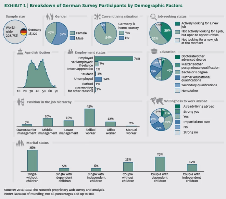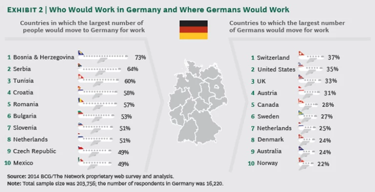 Only 44 percent of Germans have any interest in going abroad for work, significantly below the global average of 64 percent who say they would consider a job abroad, according to a survey by BCG and StepStone Deutschland, an employment website that is part of The Network. The survey had respondents in 189 countries, most of them current or recent job seekers. (See Exhibit 1.)