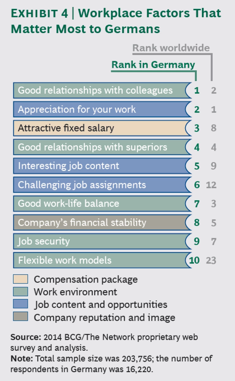Germans are much more likely than workers elsewhere to say that interesting job content and challenging work assignments are important to them. These factors rank fifth and sixth in importance, respectively, among Germans’ job preferences. Among workers globally, by contrast, interesting job content ranks ninth in importance and challenging job assignments ranks twelfth. (See Exhibit 4.)