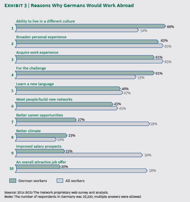 German job seekers don’t necessarily associate going abroad with getting a better job offer or more money. These reasons are relevant to barely one in five job seekers in Germany, which rebounded well from the 2008 financial crisis and is seen as having a strong job market.
