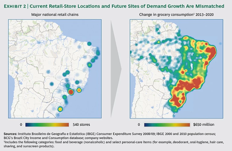 Yet few of the country’s retailers are prepared to capitalize on this growth opportunity, largely because they’ve focused their efforts almost exclusively on Brazil’s highly populated coastal cities. This mismatch between the location of current retail stores and the sites of future demand growth is striking. (See Exhibit 2.)
