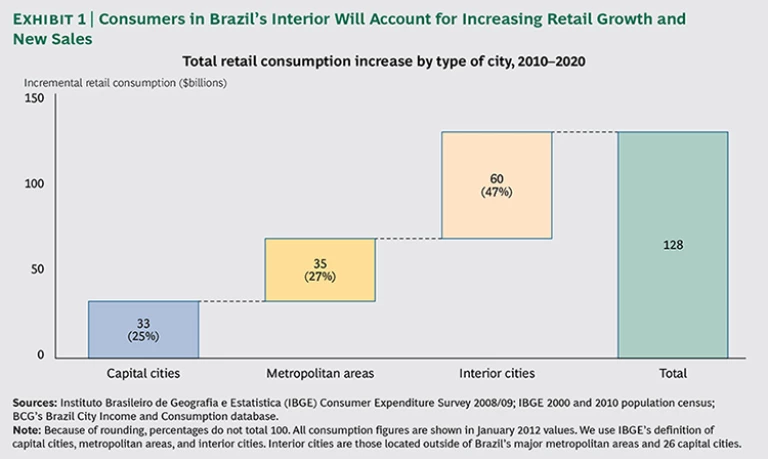 Concerned about the future, many Brazilian consumers are keeping a tighter hold on their wallets. Over the last 15 years, Brazil enjoyed a period of economic stability that fostered a strong consumer market. But the country’s economic growth is slowing—and with it, consumers’ appetite for spending. However, although consumption is projected to slow overall, Brazil’s interior cities are bucking the trend as demand growth moves inland. Through 2020, consumers in the interior regions are expected to account for more than 45 percent of growth in the retail sector, or $60 billion in new purchases. (Given the volatility of exchange rates, these numbers are approximate.) (See Exhibit 1.)