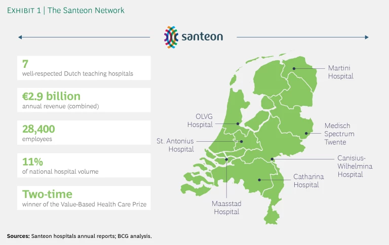 Santeon embraced the VBHC concept in 2012 and between 2015 and 2017 worked with BCG on various projects to put VBHC at the core of its collaboration model. Santeon is now widely recognized in the Netherlands and beyond as a VBHC pioneer and a driving force and partner in the movement toward a more value-based health care system. (See “The Promise of Value-Based Health Care.”)