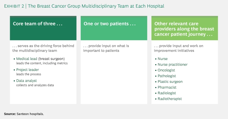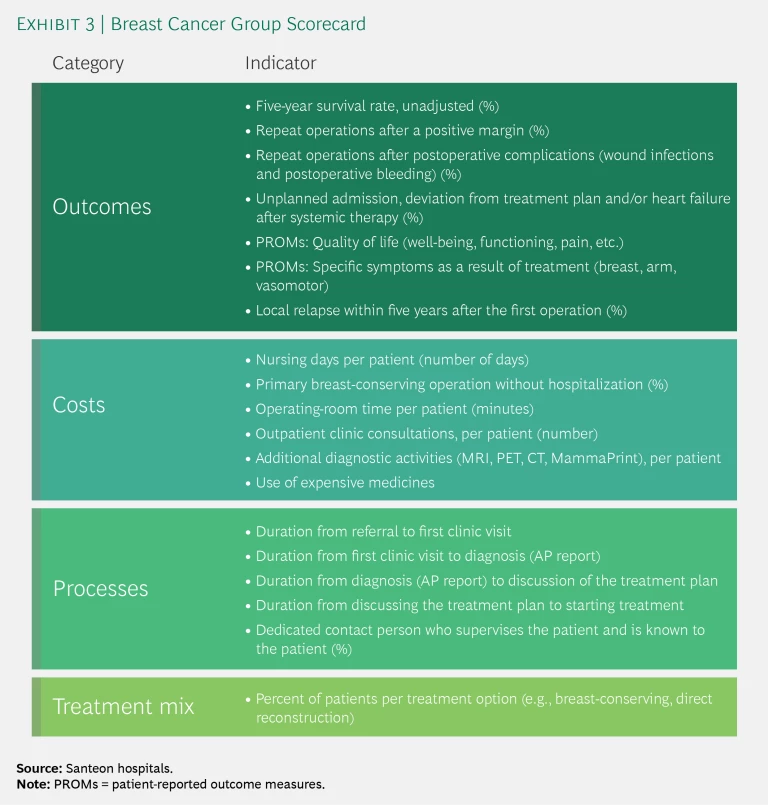 - Organize multidisciplinary teams and define the metrics. VBHC implementation within a patient group starts with forming a multidisciplinary team at each member hospital. Three core members are the driving force of each team and coordinate discussions among the seven hospitals. (See Exhibit 2.) Supported by a few central resources, one hospital takes the lead in developing a scorecard identifying 15 to 20 key outcome, cost, and process metrics relevant to its patient group. (See Exhibit 3.) It’s important for hospitals to be pragmatic about these scorecards, leveraging existing registries as much as possible and starting with metrics for which data are readily available (refining them over time if necessary). For outcome metrics, Santeon uses the International Consortium for Health Outcomes Measurement (ICHOM) indicator sets as much as possible. (See the sidebar “ICHOM’s Global Standards for Health Outcomes Measurement.”) For cost metrics, it identifies the biggest cost buckets for a patient group and the most important cost drivers to track. Santeon adds process metrics only when they are critical for patients (such as the duration of the period of high uncertainty between diagnosis and the determination of a treatment plan). Patients play a central role in defining all metrics related to the outcomes and processes that matter most to them.