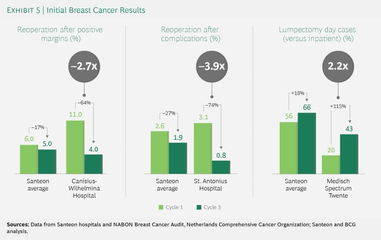 - Reoperations due to postoperative complications after lumpectomy dropped by 27% across Santeon and at St. Antonius Hospital declined by more than 70%. Although complication and reoperation rates were low in all member hospitals, a factor-4 variation between the lowest and highest percentages of reoperations after postoperative complications led the teams to investigate improvement opportunities. The safe, confidential setting established by Santeon’s VBHC model enabled the St. Antonius Hospital breast cancer team to compare the outcome scores of individual surgeons. The team found that one outstanding performer used much more intensive wound flushing during surgery. St. Antonius surgeons who then adopted this practice saw an immediate reduction in complication rates, and data from the third improvement cycle confirmed the improvement, showing a 74% decline in reoperation rates after complications.