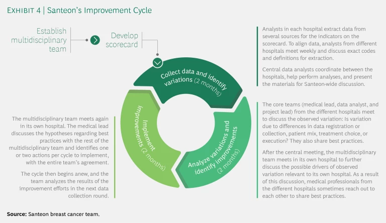 - Share results internally and implement a standardized improvement cycle for each patient group. When teams and scorecards are in place, teams embark on the improvement cycle: a continuous feedback loop that involves collecting data, analyzing data, identifying areas for improvement, and implementing improvement initiatives. (See Exhibit 4.) A safe learning environment is critical at this stage. Therefore, data and results from the first three six-month improvement cycles should be transparent only among member hospitals and not yet shared with external parties. Teams use this data not to judge one another but to form hypotheses regarding potential improvement initiatives and develop best-practice sharing on the basis of observed, clinically relevant differences. These differences are not necessarily statistically significant; making that a prerequisite to taking action could create unwarranted delays. As soon as a team seems to be performing better, it makes sense to look at it more closely and share approaches. Confidential sharing lets the teams gain familiarity with the new way of working and approaching data, highlights areas where improvement is possible, and allows time to make the first round of improvements and validate the comparability of data before going public.