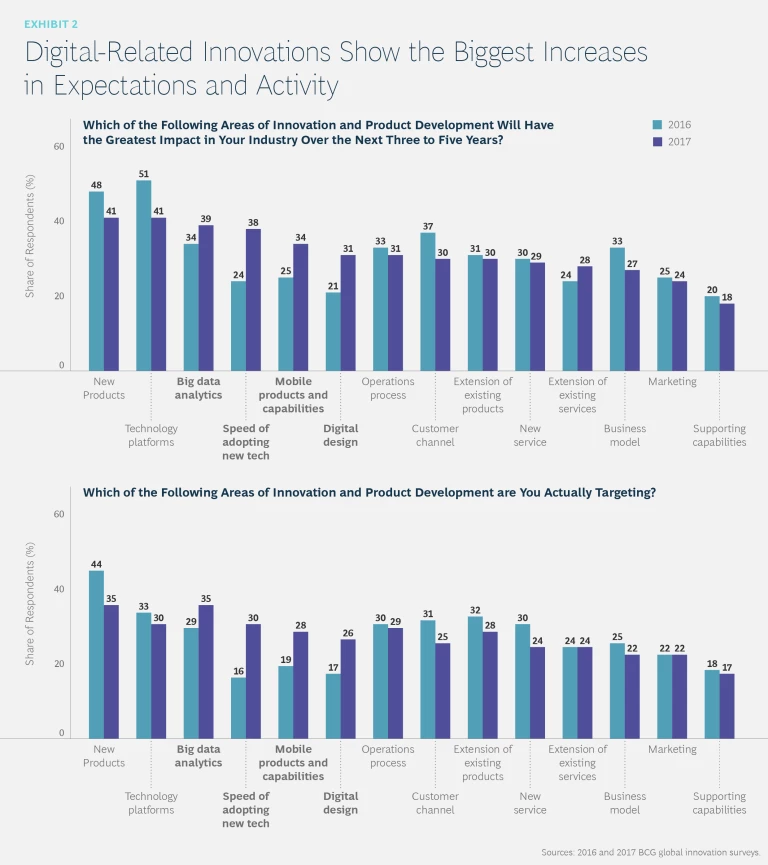 Since 2014, only four types of innovation—all related to digital—have grown in importance and are being pursued by more companies: big data analytics, the fast adoption of new technologies, mobile products and capabilities, and digital design. (See Exhibit 2.)