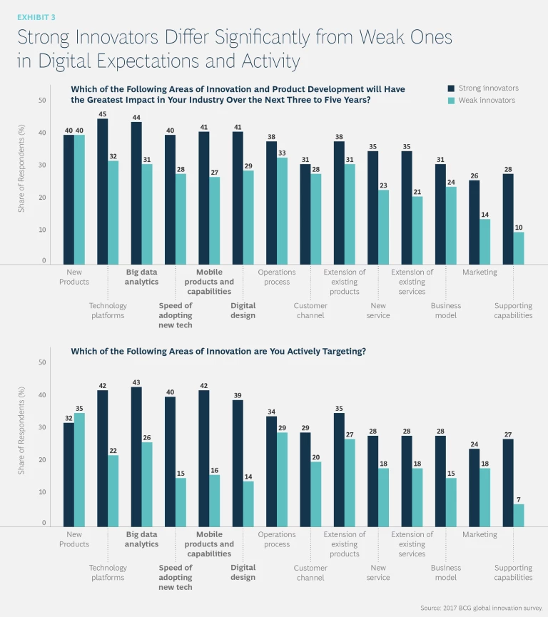 There are significant gaps in many areas between companies that describe themselves as strong in innovation and those that think they are weak, but the divide in the digital aspects of innovation is particularly striking. It indicates that companies with effective digital innovation programs are getting stronger while the weak are falling further behind. For example, strong innovators attach much greater importance than weak ones to the four types of digital-related innovation discussed above, as well as to technology platforms in general. There are even bigger chasms with regard to how aggressively companies are pursuing these innovation avenues. (See Exhibit 3.)
