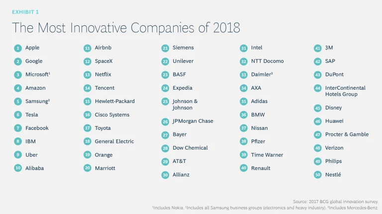 Exhibit 1 ranks the 50 most innovative companies for 2018. The companies at the top of the list changed only slightly from those in our last report. (See The Most Innovative Companies 2016: Getting Past “Not Invented Here,” BCG report, January 2017.) Two digital natives pushed their way into the top 10 this year: Alibaba Group, which joined the top 50 for the first time, and Uber. Among the top 20, Tencent is also new to the list, and Airbnb, SpaceX, Cisco Systems, Orange, and Marriott moved up—some significantly. Overall, 12 companies either joined the list or returned to it.