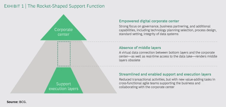 Support functions can only capitalize on digital if they are reorganized to better reflect the way that technology changes how work gets done. For this reason, the support function of the future will be rocket-shaped, rather than pyramid-shaped. (See Exhibit 1.) At the top will be a stronger digital corporate center, controlling data, setting governance policies, and providing insights to help steer the business.