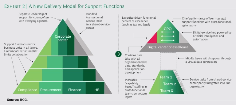 At most organizations, support functions still look largely the same today as they did two or three decades ago. They feature a traditional, pyramid-shaped organizational structure in which functions like HR, legal, and finance are set up to mirror the business units. We believe this is an outdated approach and one that will become even less tenable over time. Digital technology is changing just about every aspect of how companies operate—and companies will not be able to capitalize on digital unless they put the right operating model in place. Otherwise, they’re essentially trying to bolt a turbocharged engine onto a wooden cart.