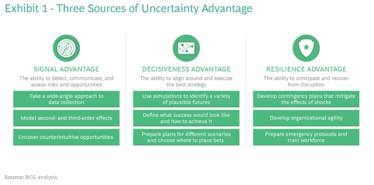 The good news is that companies don’t need to reinvent themselves to gain uncertainty advantage. They just need to become better at detecting signals, more decisive in acting on them, and more proactive in building practices that foster resilience. (See Exhibit 1.)