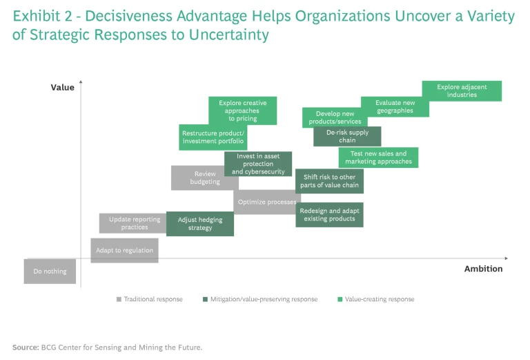 BCG’s research has found that some organizations are much better than others at managing this degree of uncertainty. A few even thrive on it. They find opportunities in places where others aren’t looking and shore up their organizations so they can anticipate volatility earlier and spring back faster. These companies have what we call “uncertainty advantage.” With the right data, processes, commitment, and mindset, others can build this advantage into their organizations, too.