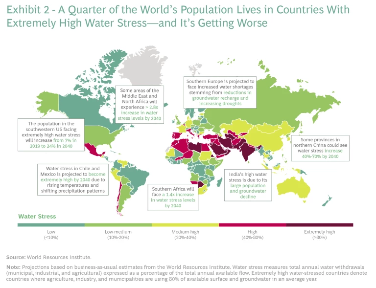 Over two billion people lack access to clean and safely managed water. As of 2019, one quarter of the world’s population lived in countries with extremely high water stress—defined as countries where 80% of the available surface and groundwater is being used by agriculture, industry, and municipalities in a given year. (See Exhibit 2.) The situation will only get worse: by 2025 two-thirds of the world’s population will face water shortages, and by 2040 roughly one quarter of the world’s children will be living in areas of extremely high water stress, according to UNICEF. With less than acceptable sanitation and hygiene conditions, preventable water-related diseases are claiming tens of thousands of lives, especially among children under five.