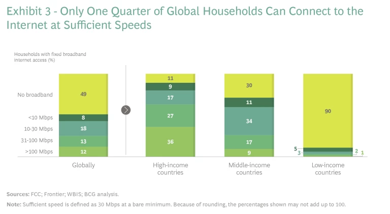 Ensure universal connections to digital infrastructure. Internet access inequality is more pervasive in developing economies—where the web is available to only about 40% of the population—than in developed countries, where accessibility ranges from 70% to 98%. Yet all countries suffer from inequality of opportunity for their citizens when any type of connectivity gap exists. Beyond the coverage shortcomings, web connectivity speed varies by location as well; only one quarter of the world’s population can access the web at speeds that allow for an acceptable user experience. (See Exhibit 3.)