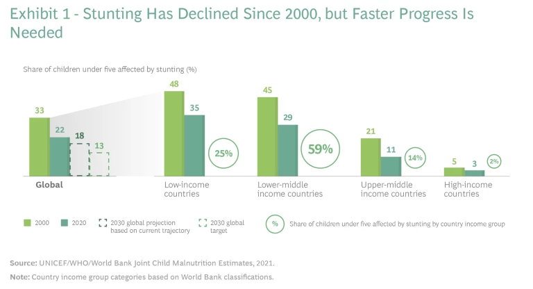There is little disagreement that hidden hunger is an important issue, one that should be dealt with quickly. Indeed, the UN SDGs call for ending all forms of malnutrition by 2030 and dramatic reductions in stunting and wasting in children five and younger by 2025. But those goals, while praiseworthy, are out of reach without immediate and intense efforts. Since 2000, stunting of children under five has declined from 33.1% globally to 22.0% in 2020—a decent reduction, but it took too long to achieve it. Based on the current trajectory, stunting will still be at 18% in 2030; in order to reach even the more modest goal of 13%, the rate of improvement would need to be more than doubled. (See Exhibit 1.)