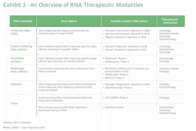 Indeed, as some countries emerge from the pandemic and others continue to fight it, infectious diseases may seem like the ideal application for RNA. But other therapeutic areas are also the subject of significant research and investment activity, including oncology (vaccines and therapies), genetic disease, cardiology, and neurology. (See Exhibit 2.)