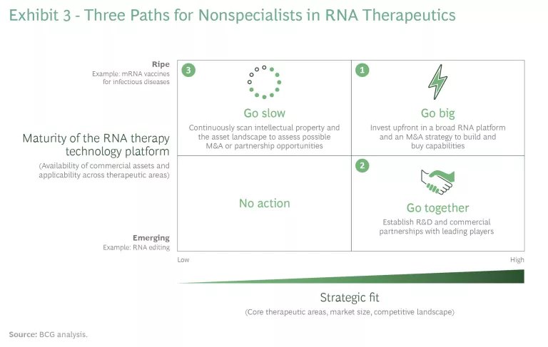 - Go big. This option is primarily for companies that perceive a threat (because of the potential for disruption) or an opportunity in one or more therapeutic areas of interest. Players will need a comprehensive strategy and to establish a strong position, perhaps leveraging a broad RNA technology platform that allows them to play in multiple therapeutic areas of strategic interest. This path will likely include M&A to build internal capabilities and expertise.