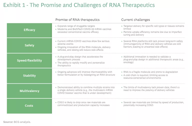 Several attributes make RNA one of the most promising new treatment technologies. (See Exhibit 1.) These include a fit-for-purpose molecular design and functional versatility against a wide range of “druggable” targets. While RNA still faces long-term safety and efficacy (as well as likely cost) challenges, recent advances suggest material technology improvements are coming soon. We believe that the success of mRNA COVID vaccines will propel a sooner-than-expected wave of RNA innovation in the industry. Major pharma companies need to take stock and determine how they want to participate (or watch) as the coming wave builds. Those that want a role in shaping the wave should move now if they haven’t already started.