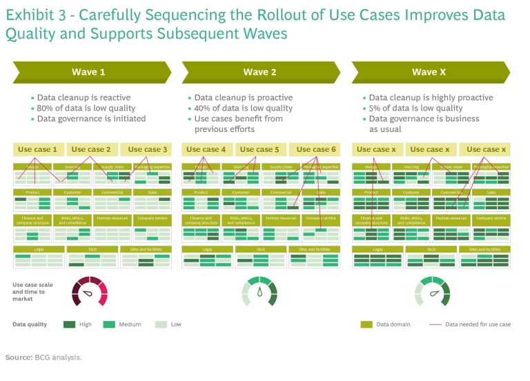 Then—and this is critical—the e-tailer sequenced the rollout of use cases so that, to the extent possible, the first wave leveraged and improved data assets that would benefit subsequent use cases, accelerating their deployment and the business impact. (See Exhibit 3.)